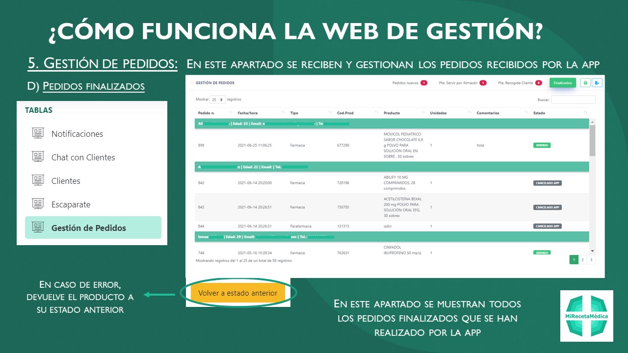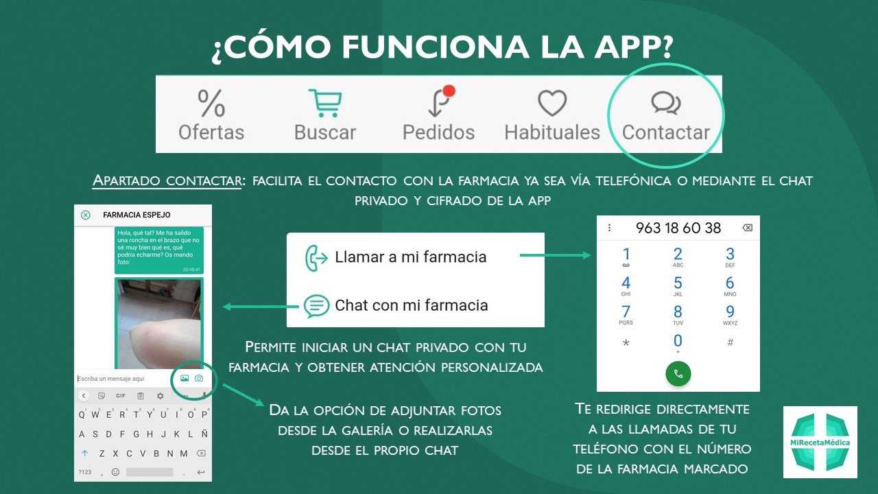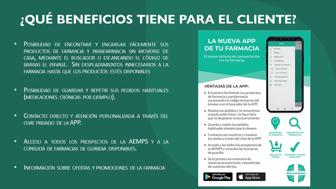 Incorpora unas ágiles búsquedas de producto con imágenes y sus diferentes presentaciones, así como seguimiento de pedidos, edición de medicamentos crónicos, un chat privado con la farmacia elegida, información de farmacias de guardia de toda España, y muchas más prestaciones.